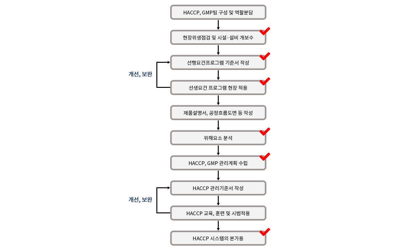 Áß¿ä°ü¸®Á¡, ÇѰè±âÁØ, ¸ð´ÏÅ͸µ ¹æ¹ý, ±âÁØ ÀÌÅ»½Ã °³¼±Á¶Ä¡ ¹æ¹ý µîÀ» Æ÷ÇÔÇÏ´Â HACCP, GMP °ü¸®°èȹÀ» ¼ö¸³ÇÕ´Ï´Ù.